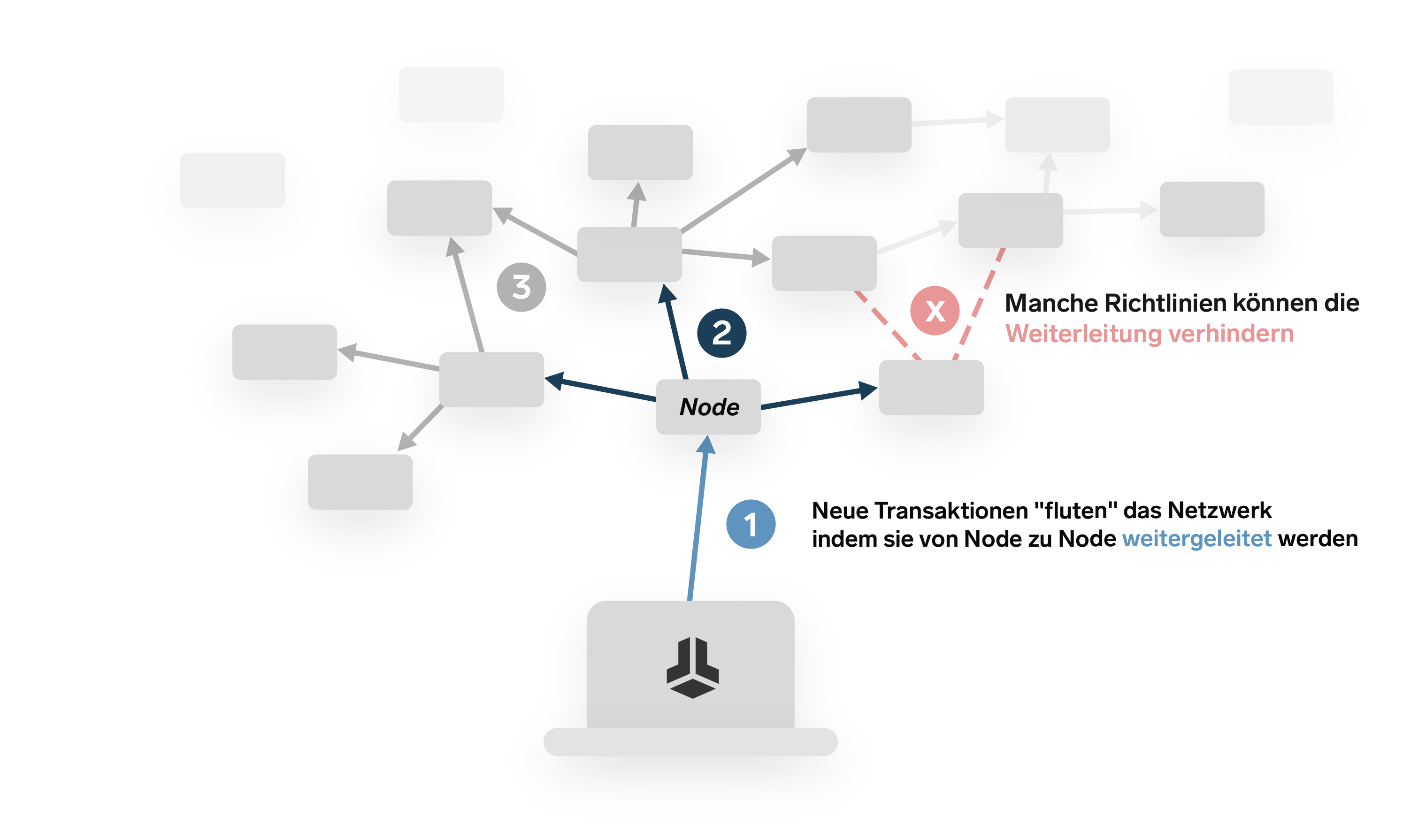 Letztlich erreichen die meisten Transaktionen fast alle Nodes – selbst wenn einige sie nicht weiterleiten, wie man es auch etwas vereinfacht in der Grafik erkennen kann.
