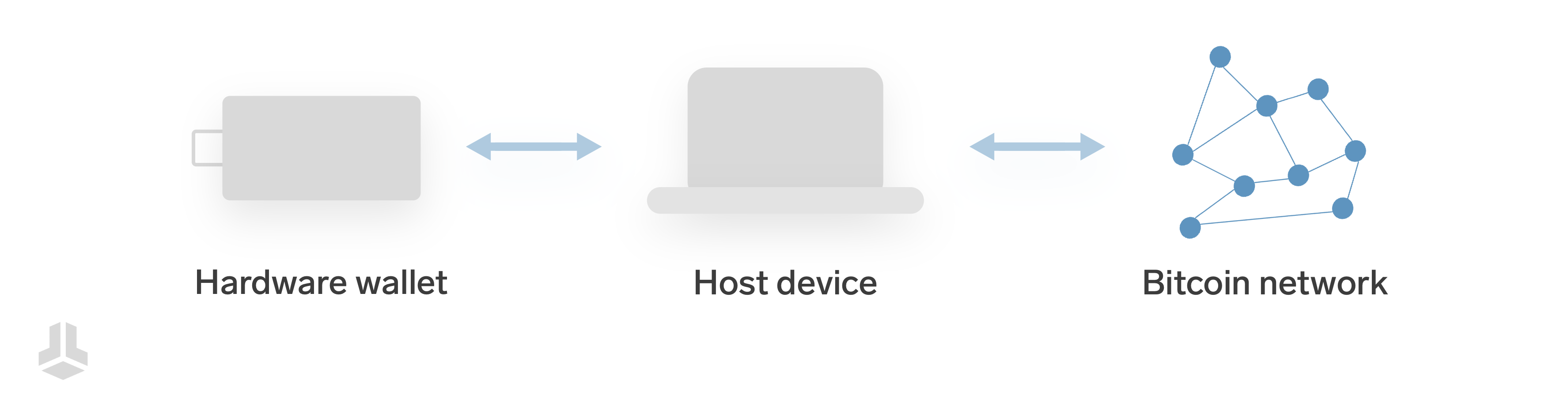 A hardware wallet communicates with the blockchain via an app on a host device. The wallet securely stores sensitive information and signs transactions, while the host device sends and receives transaction data.