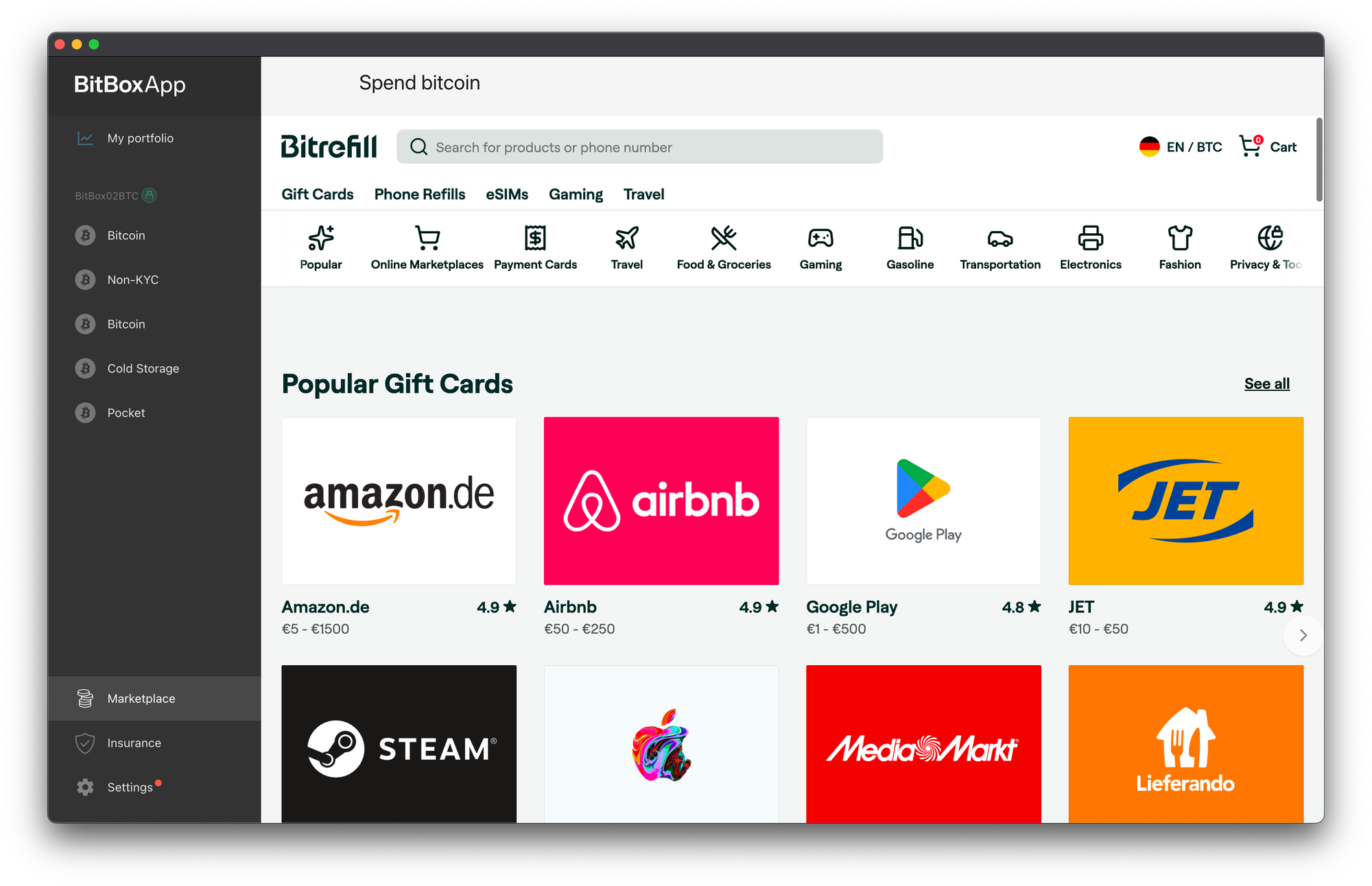 - Access Bitrefill: In the BitBoxApp, we renamed the Buy & Sell section in the lower left corner to “Marketplace”. Click on it and choose “Spend”. Next, choose Bitrefill. This is where you can browse all the gift card categories and offers powered by Bitrefill, directly within the app interface.