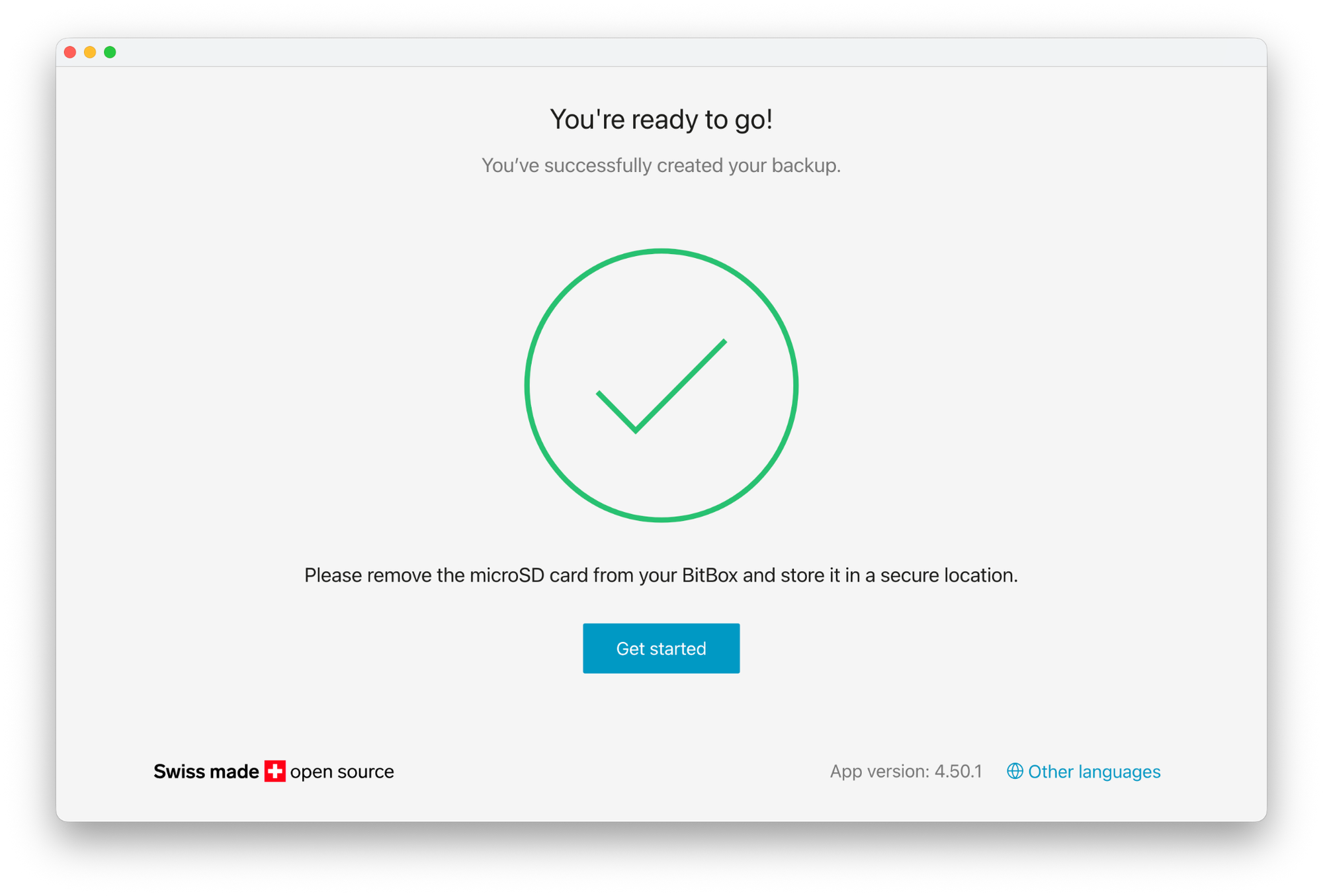 The microSD backup is not a closed ecosystem. It stores the recovery words in a convenient format, while maintaining full compatibility with the BIP-39 industry standard. Recovery is fast and straightforward, and in emergency situations, where you don’t have access to a BitBox anymore, you can either restore with the recovery words manually, or use our open source backup recovery tool to read the content of the microSD card.