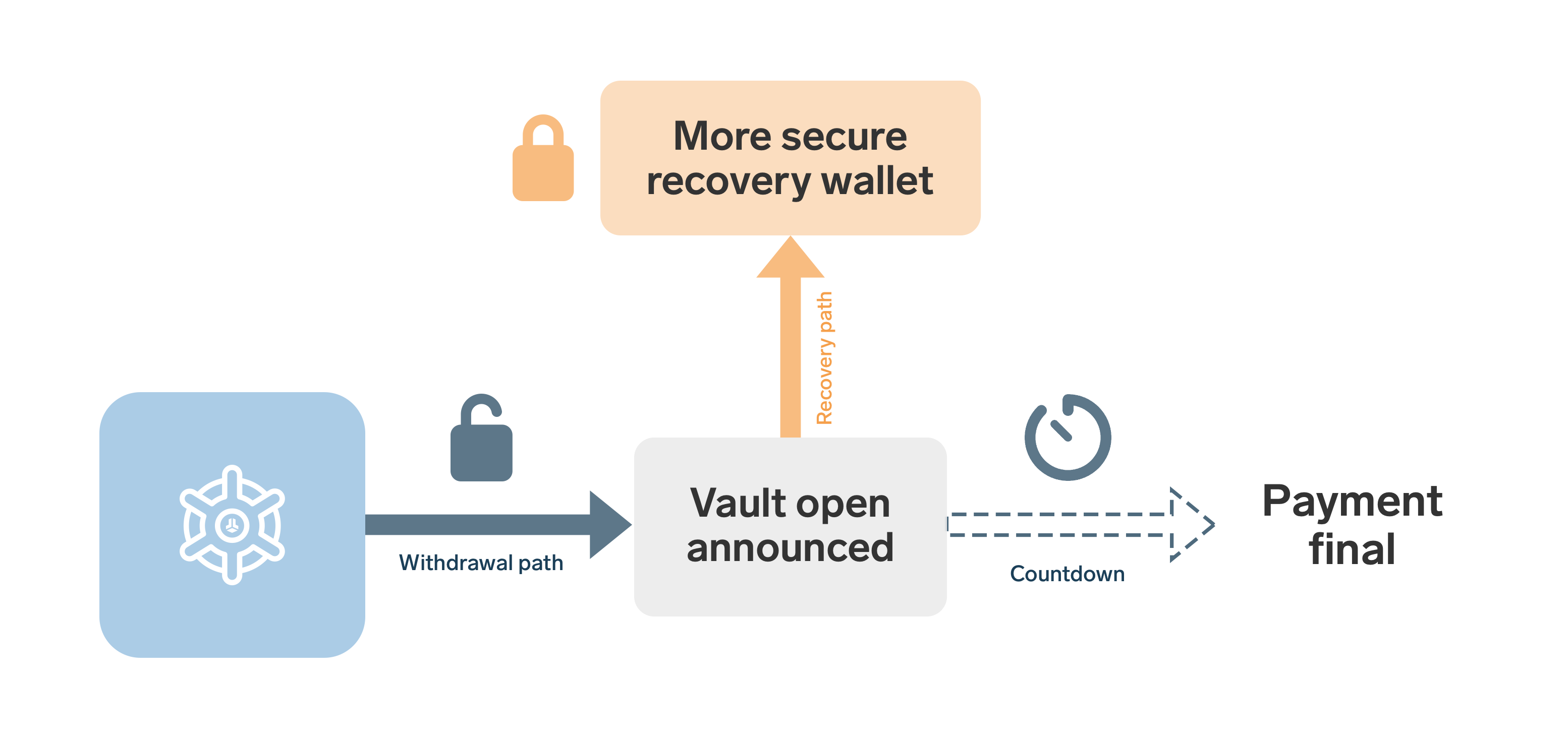 - La ruta de recuperación puede abortar cualquier intento de abrir la bóveda durante la cuenta regresiva, redirigiendo los fondos a una billetera más segura.