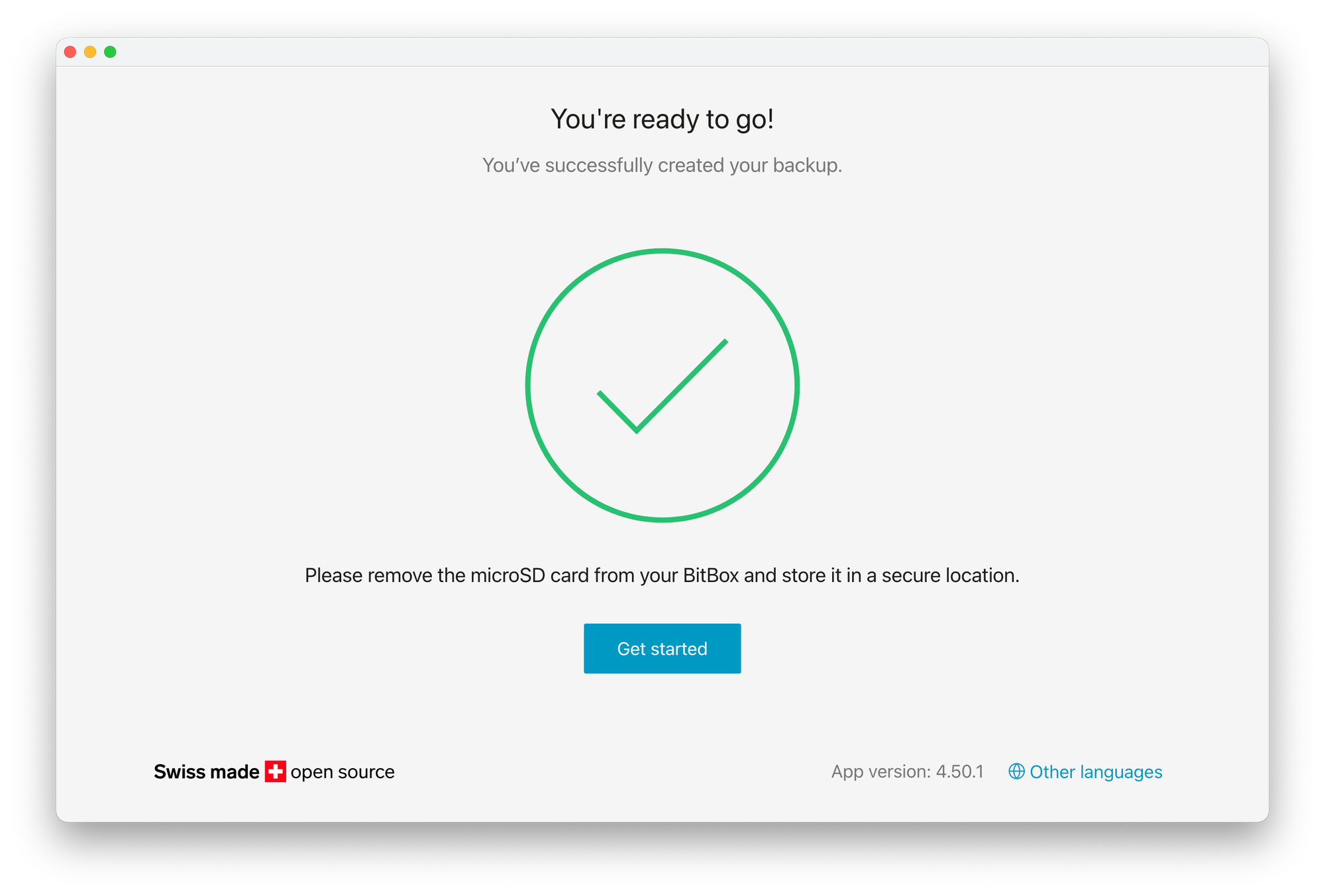 Al crear la copia de seguridad directamente en la tarjeta microSD, la BitBox elimina toda esta clase de errores durante la configuración. Por supuesto, esto no exime de responsabilidad al usuario. Después de que se haya creado la copia de seguridad, la tarjeta microSD debe tratarse exactamente como una copia de seguridad normal en papel, ya que otorga acceso a tu billetera, al igual que lo harían las palabras de recuperación normales.