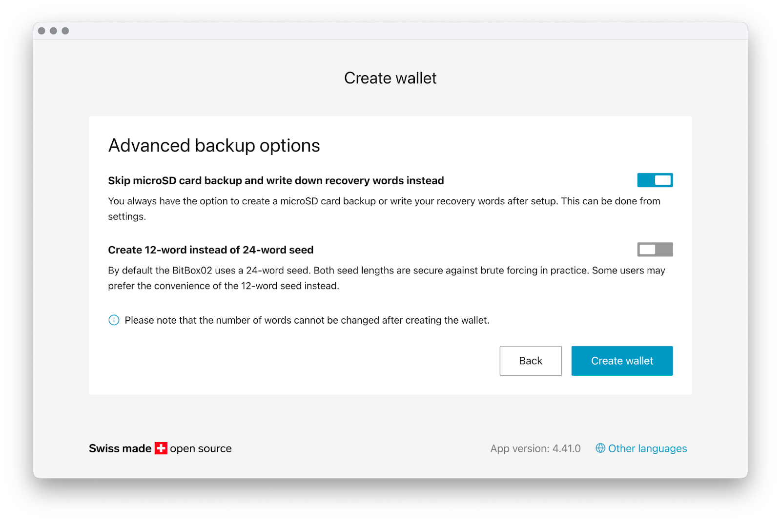 No todos los usuarios quieren una copia de seguridad en una tarjeta microSD, y eso es perfectamente válido. Algunos prefieren un enfoque más manual* desde el principio. Los usuarios experimentados puede que ya tengan sus propios procedimientos de copia de seguridad establecidos. Por esta razón, BitBox te permite omitir la copia de seguridad automática en la microSD durante la configuración y, en su lugar, proteger tus palabras de recuperación manualmente en papel o acero.