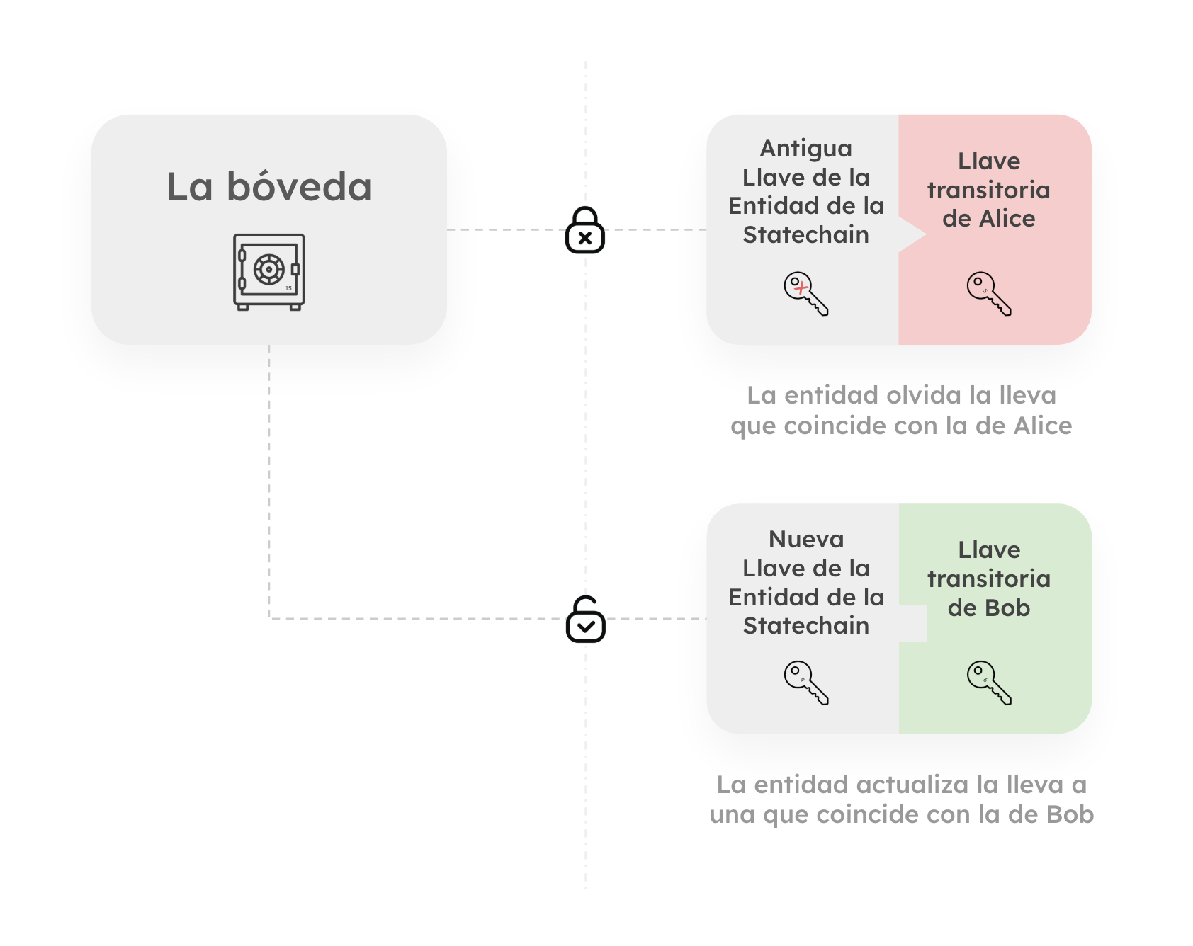 Ahora, imagina que Alice quiere vender este bitcoin a un comprador, Bob. En una transacción estándar on-chain (en la cadena), Alice abriría la bóveda, sacaría el bitcoin y lo llevaría caminando hasta la bóveda de Bob. Esto es lento, costoso y deja una huella. En una Statechain, el bitcoin se queda exactamente donde está. En lugar de mover el activo, Alice y la Entidad realizan una "Cambio de Cerradura". Alice presenta a Bob ante la Entidad y, juntos, generan un nuevo mecanismo de cierre para la bóveda que responde a la llave de Bob en lugar de a la de Alice, pero que aún necesita la ayuda de la Entidad para desbloquearse. Crucialmente, tan pronto como este nuevo cierre está activo, la Entidad elimina el fragmento que coincidía con el de Alice.