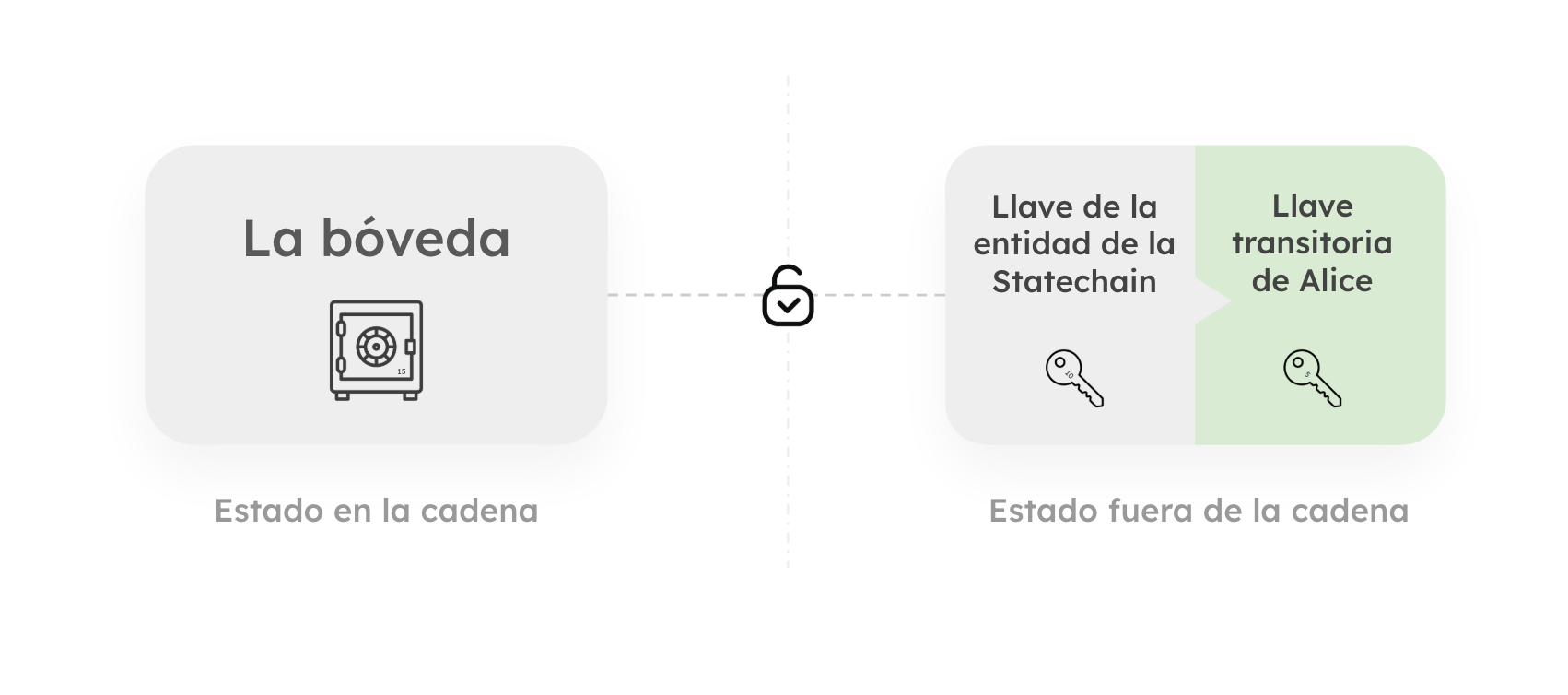 Imagina una bóveda transparente de alta tecnología situada en una plaza pública. Dentro hay un lingote de oro, o mejor aún, algo de bitcoin. Todo el mundo puede verlo y todos saben exactamente dónde está. Esta bóveda tiene una característica de seguridad única: no tiene cerradura física. En su lugar, se abre solo cuando recibe una señal digital específica construida a partir de dos fragmentos matemáticos separados. Un fragmento lo tiene Alice, la propietaria (imagina que eres tú). El otro fragmento lo tiene la Entidad de la Statechain (un operador neutral), muy parecido a una caja de seguridad donde tu banco tiene una llave y tú tienes la otra. Ninguno de los dos puede abrir la bóveda por sí solo. La Entidad no es un custodio; no pueden huir con el bitcoin porque carecen del fragmento de Alice. Alice, a la inversa, no puede gastar el dinero en la blockchain principal de Bitcoin sin que la Entidad co-firme la transacción de Alice. Están en un punto muerto, pero es un bloqueo cooperativo.