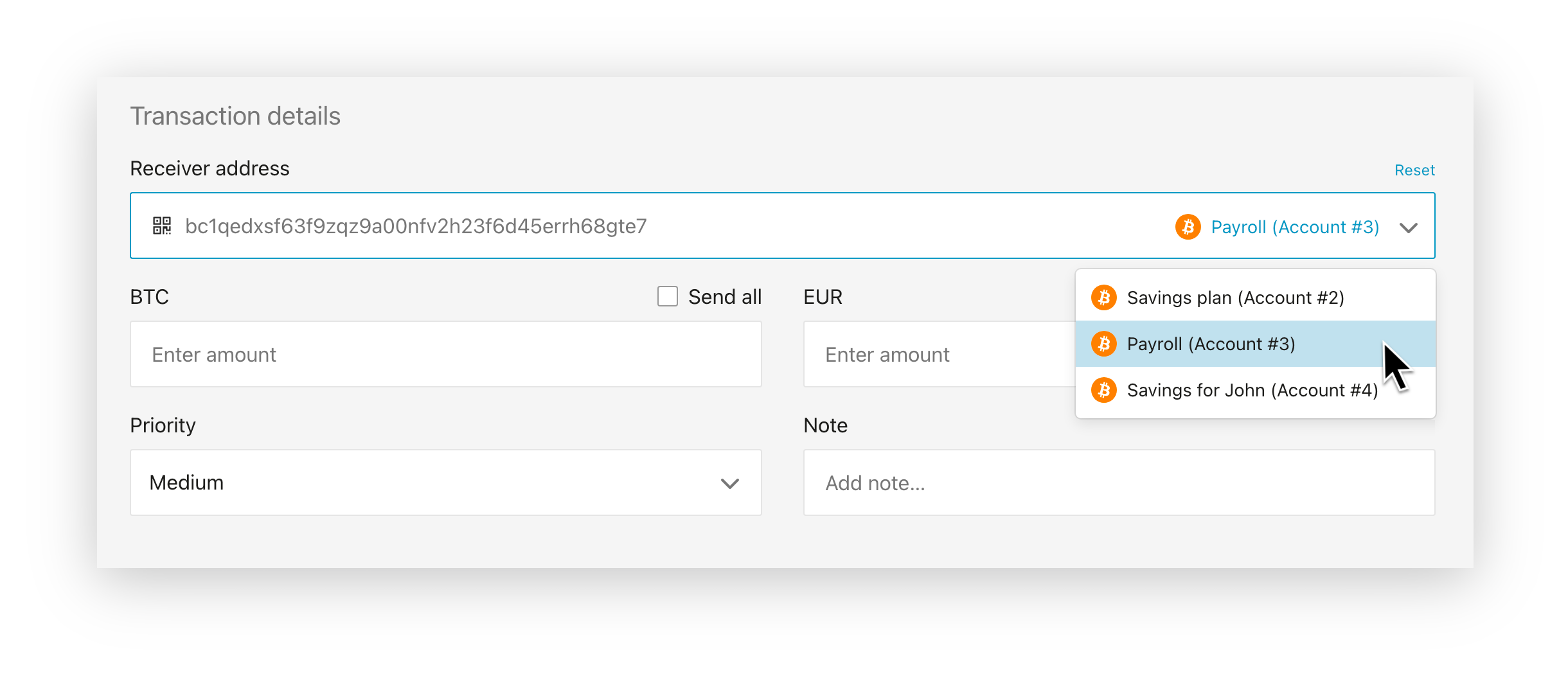 Se hai bisogno di inviare una transazione Bitcoin a te stesso, ad esempio per spostare fondi su un account diverso o per consolidare i tuoi UTXO, ora puoi selezionare rapidamente l’account desiderato tramite un nuovo menù a tendina nella schermata Invia. La BitBoxApp utilizzerà automaticamente il prossimo indirizzo di ricezione inutilizzato dall’account selezionato per completare la transazione.