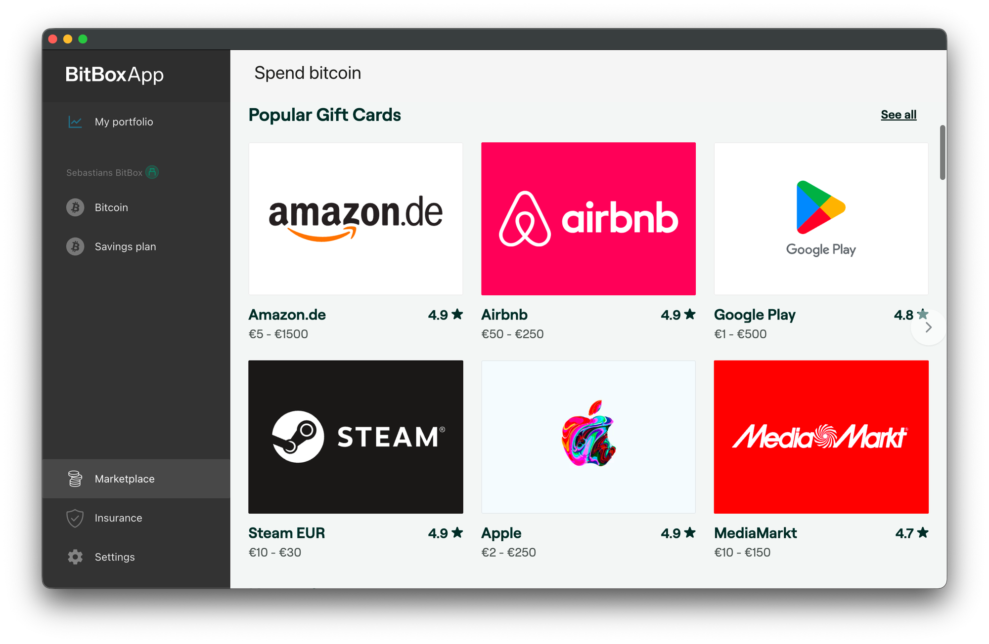 Per rendere questo processo più semplice e immediato, abbiamo collaborato con Bitrefill e integrato il servizio direttamente nella BitBoxApp, permettendoti di acquistare gift card (e non solo) in pochi clic utilizzando il tuo BitBox.