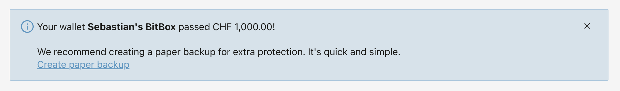 Naturalmente, puoi ignorare questo messaggio se hai già creato un backup cartaceo del tuo wallet. In tal caso, la BitBoxApp su quel dispositivo lo registrerà e non ti mostrerà più questo promemoria.