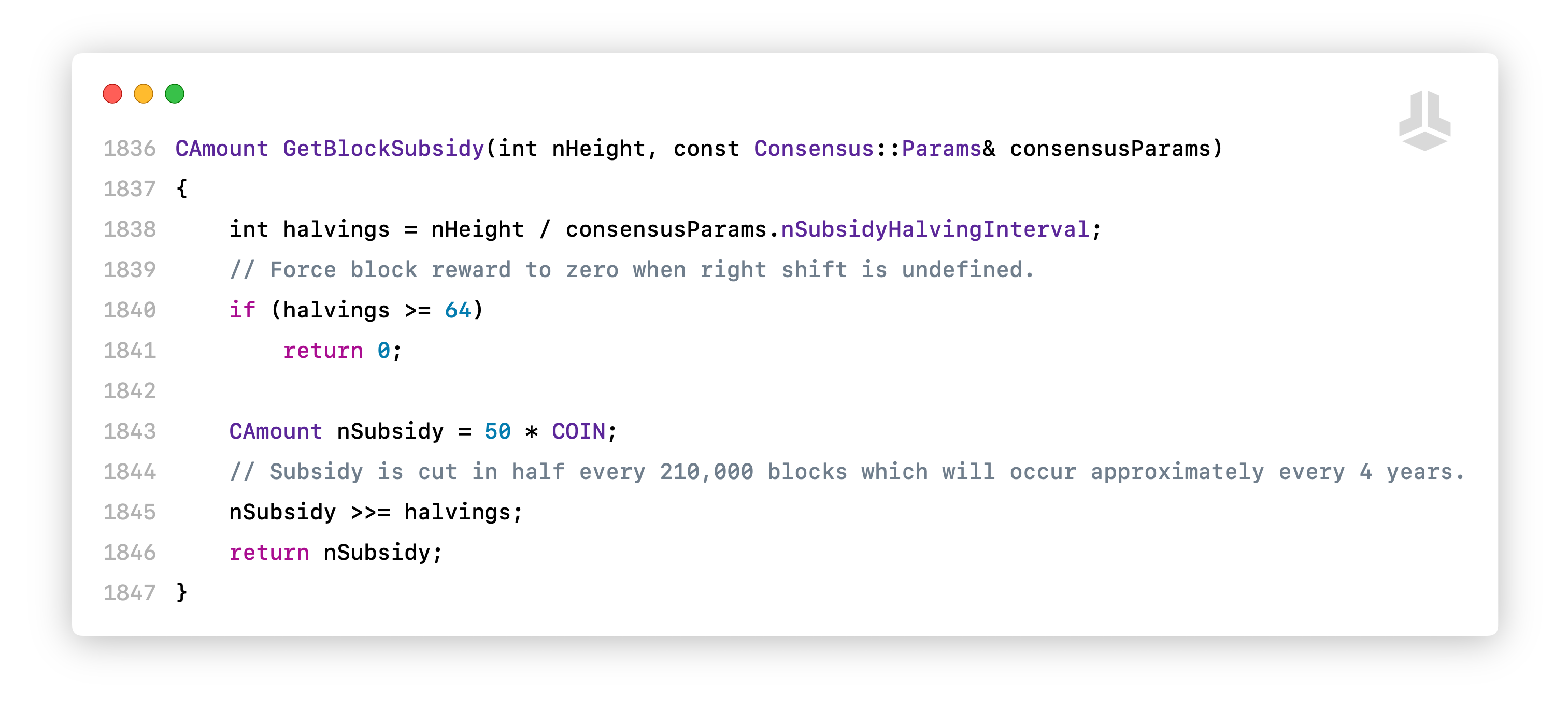 Questo blocco è composto da due parti che definiscono la ricompensa: la prima calcola a quale halving ci troviamo attualmente e imposta la ricompensa a 0 dopo 64 halving.