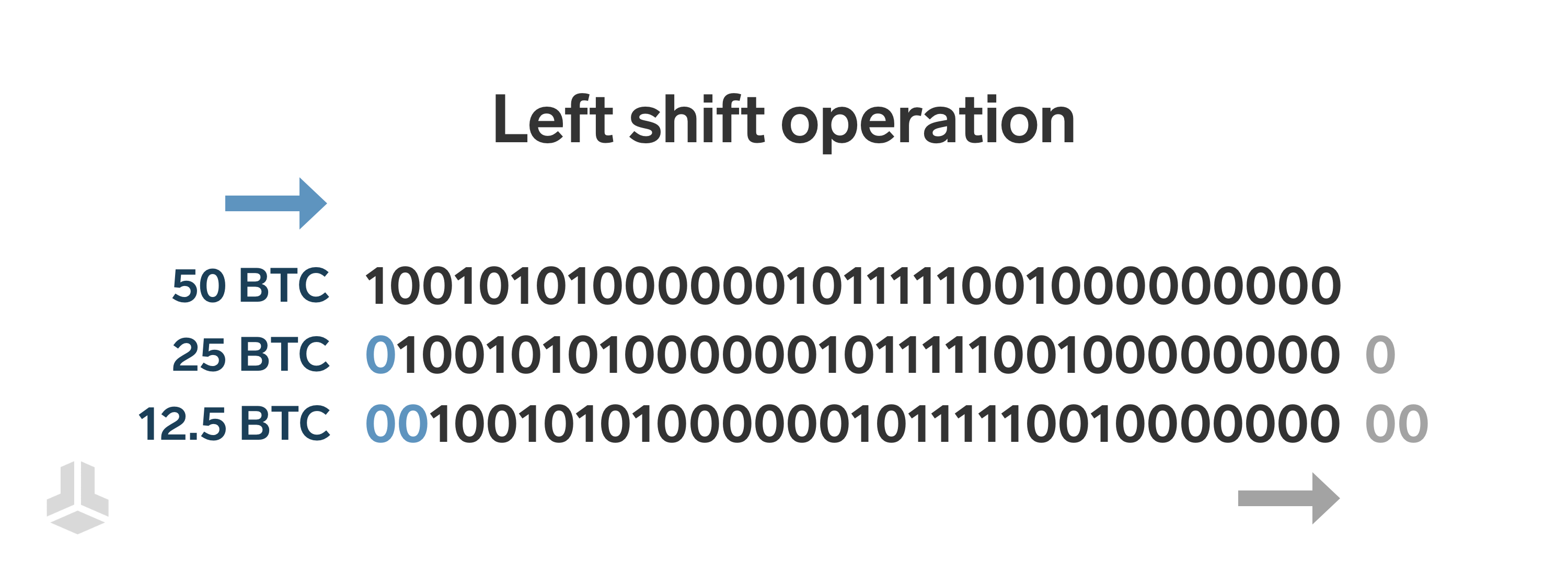 sposta questa sequenza di bit verso destra, rimuovendo di fatto una cifra. In termini binari, questo equivale a dividere per due — esattamente ciò che accade durante ogni halving.