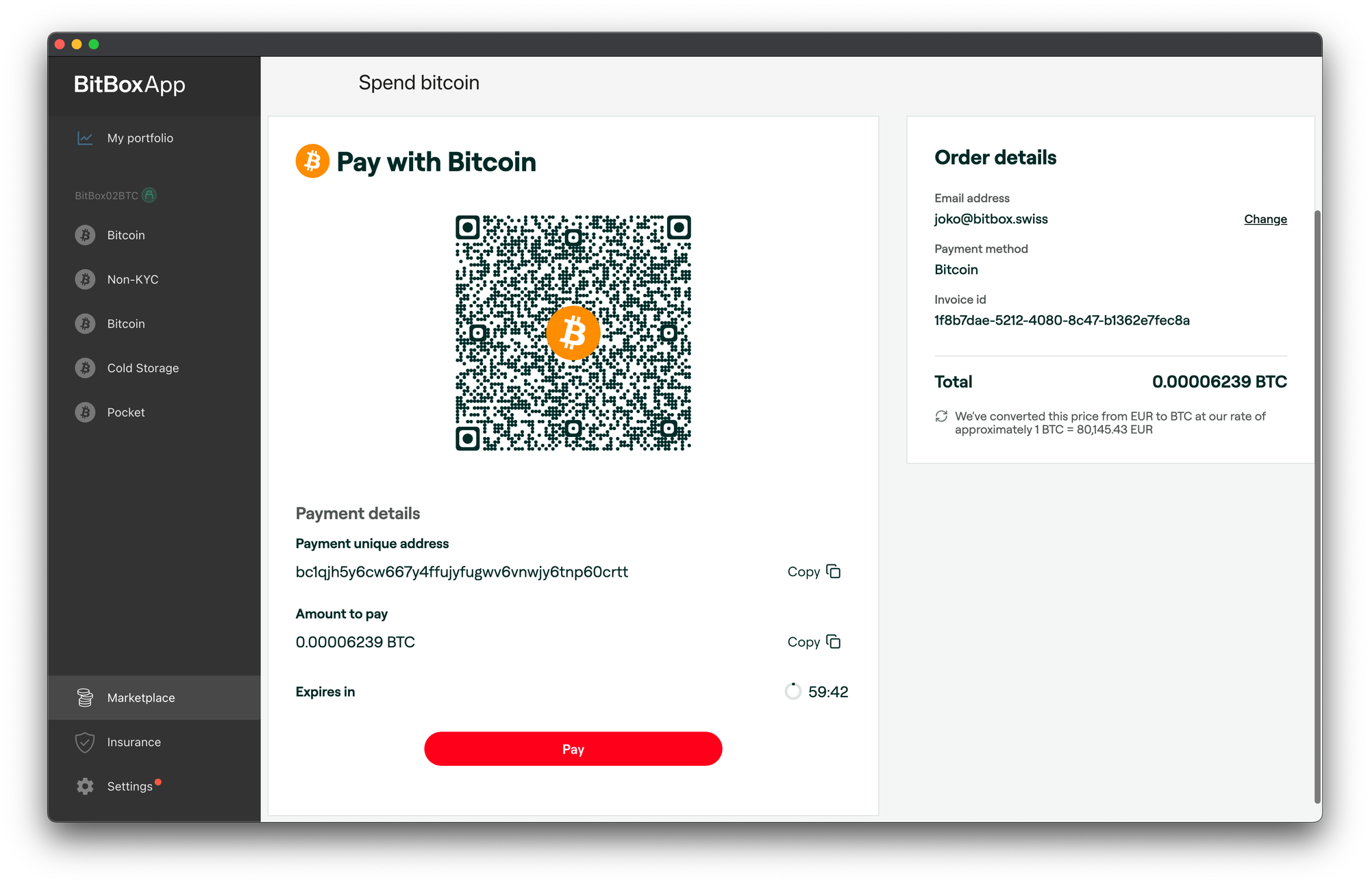 - Paga in Bitcoin: procedi al checkout. Inserisci l’indirizzo email al quale vuoi ricevere il voucher. Dopo aver cliccato su “Pay”, la BitBoxApp genererà automaticamente i dettagli del pagamento. Ti basta confermare la transazione verso Bitrefill sulla tua BitBox – esattamente come faresti per inviare Bitcoin a qualsiasi altro destinatario.