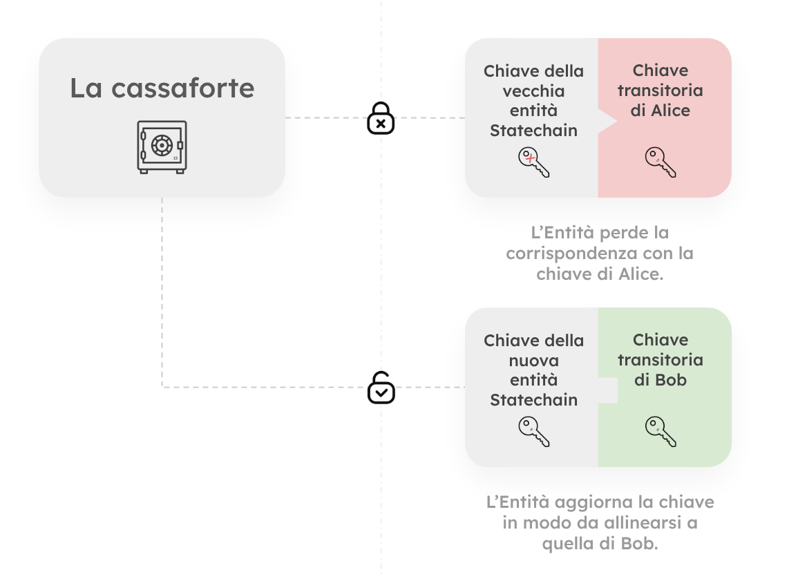 Ora, immagina che Alice voglia vendere questi bitcoin a un acquirente, Bob. In una transazione standard on-chain, Alice aprirebbe la cassaforte, preleverebbe i bitcoin e li porterebbe nella cassaforte di Bob. Questo è lento, costoso e lascia una traccia. In una Statechain, i bitcoin rimangono esattamente dove si trovano. Invece di spostare l'asset, Alice e l'Entità eseguono un "Aggiornamento delle chiavi". Alice presenta Bob all'Entità e insieme generano una nuova serratura per la cassaforte che risponde alla chiave di Bob invece che a quella di Alice, ma che richiede ancora l'aiuto dell'Entità per essere aperta. Dettaglio fondamentale: non appena questa nuova serratura è attiva, l'Entità elimina il frammento che corrispondeva alla chiave di Alice.