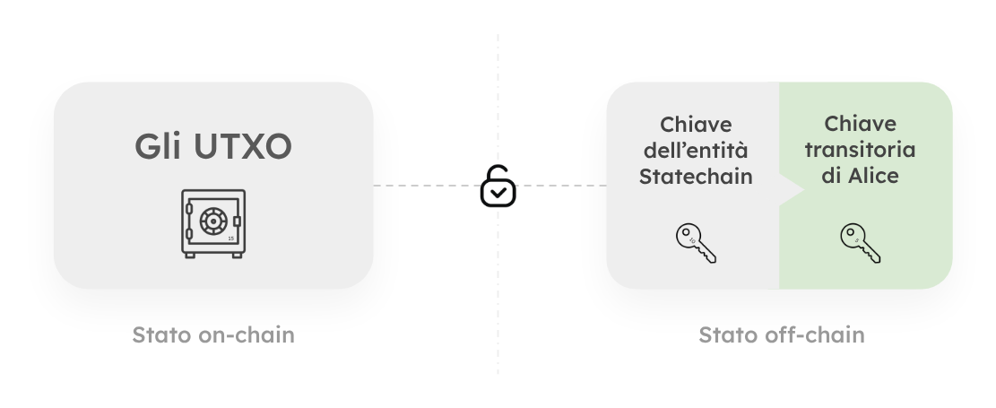 Immagina una cassaforte trasparente ad alta tecnologia situata in una piazza pubblica. All'interno c'è un lingotto d'oro, o meglio ancora, un po' di bitcoin. Tutti possono vederla e tutti sanno esattamente dove si trova. Questa cassaforte ha una caratteristica di sicurezza unica: non ha una serratura fisica. Si apre solo quando riceve un segnale digitale specifico costruito da due frammenti matematici separati. Un frammento è detenuto da Alice, il proprietario (immagina che sia tu). L'altro frammento è detenuto dall'Entità Statechain (un operatore neutrale), proprio come una cassetta di sicurezza dove la tua banca tiene una chiave mentre tu possiedi l'altra. Nessuno dei due può aprire la cassaforte da solo. L'Entità non è un custode e non può fuggire con i bitcoin perché le manca il frammento di Alice. Alice, al contrario, non può spendere il denaro sulla blockchain principale di Bitcoin senza che l'Entità co-firmi la transazione di Alice. Sono in stallo, ma è uno stallo cooperativo.